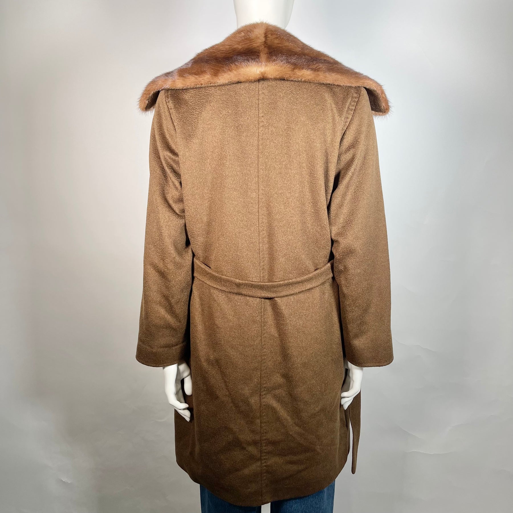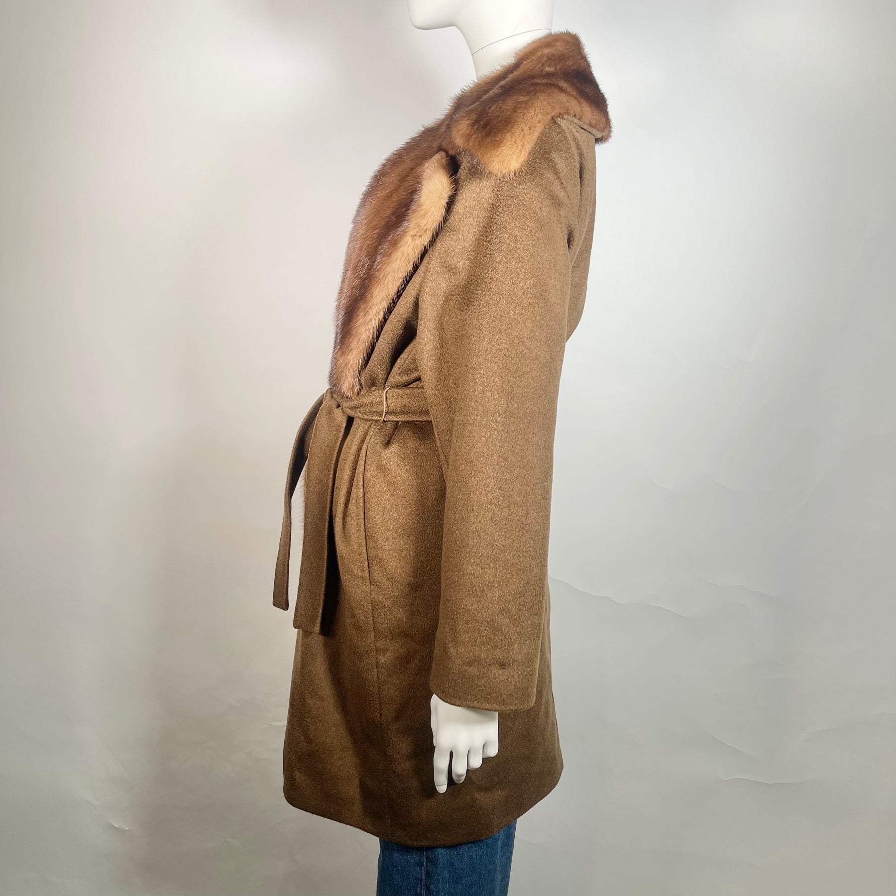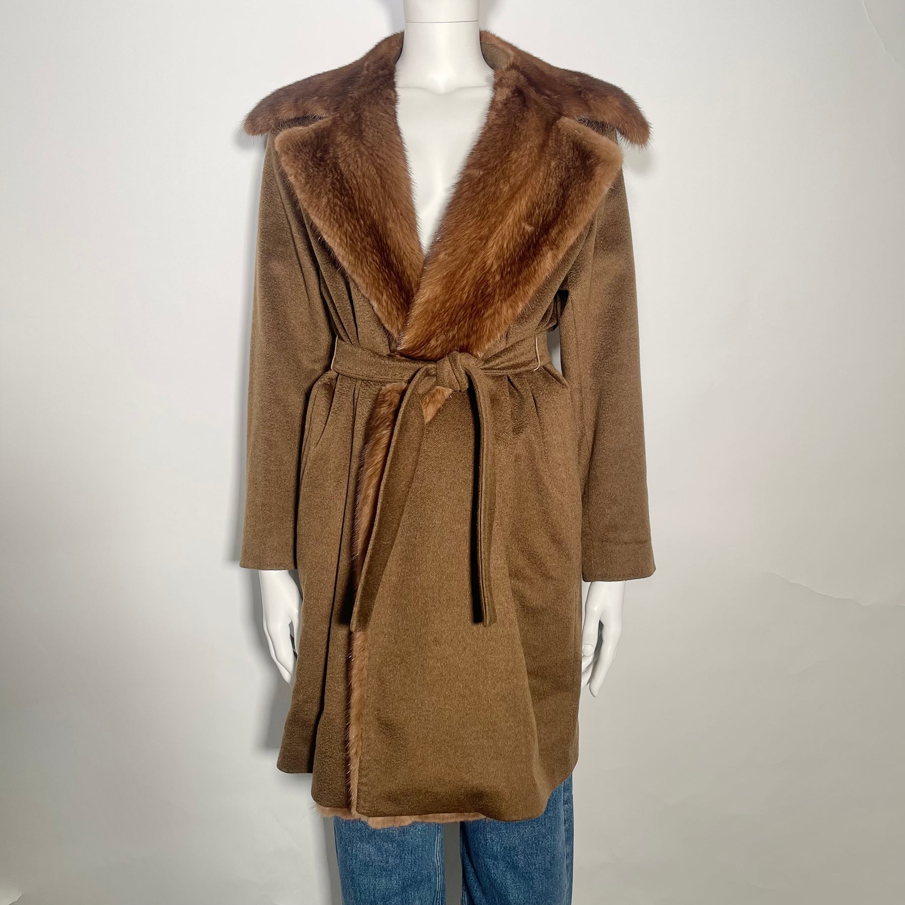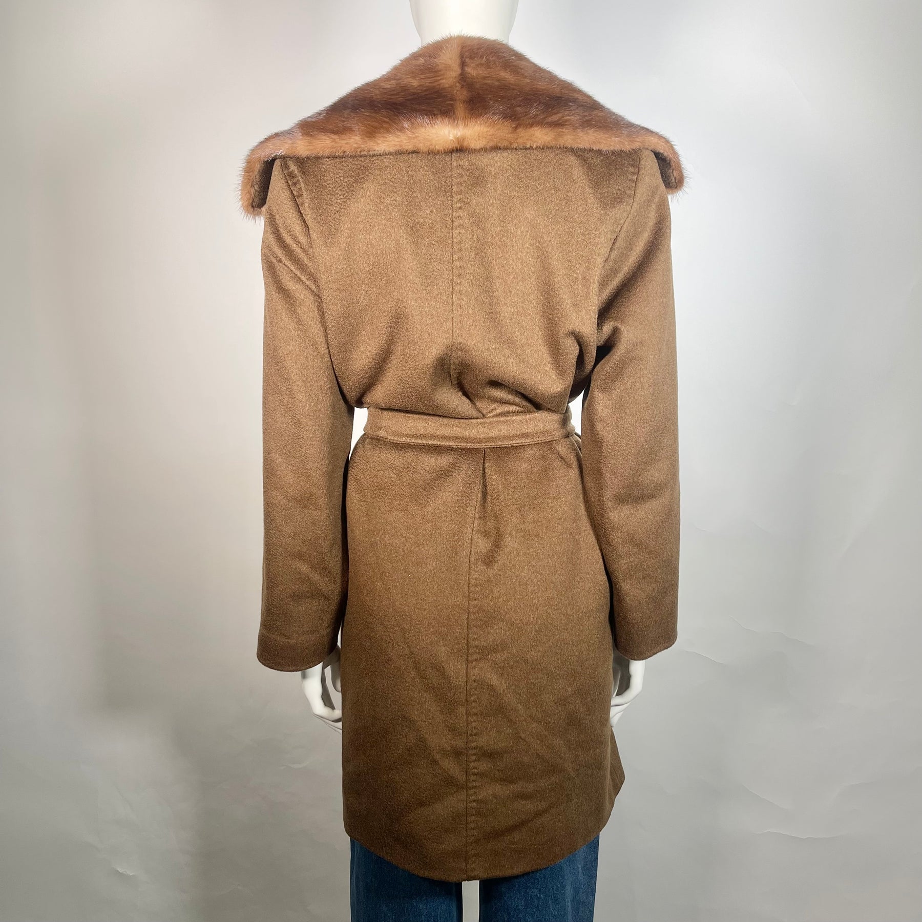 MAX MARA Vintage Coat IT 36 UK 8-12 Brown Cashmere Mink Trim Belted Mid Length